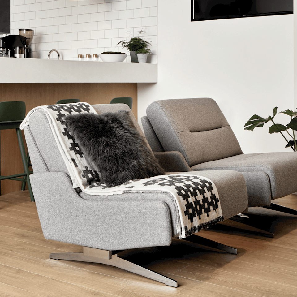 Onze banken zijn vermomd als mooie fauteuils en nemen niet veel ruimte in beslag. Druk op het onopvallende bedieningspaneel aan de zijkant van de zitting en de stoel verandert in een comfortabele relaxfauteuil met verstelbare ondersteuning voor uw hoofd en benen.