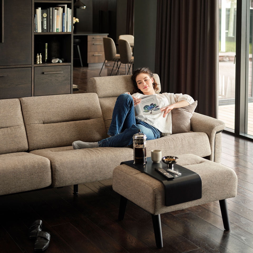 Isolez-vous du monde extérieur en fermant les rideaux, lorsque le moment est venu de vous détendre et de vous ressourcer. Nous avons tous besoin de temps pour réfléchir et nous ressourcer, et un fauteuil Stressless® est comme une caresse chaleureuse pour l’âme. Lorsque vous vous enfoncez dans le rembourrage, vous pouvez sentir comment le design soutient l’ensemble de votre corps afin que vous puissiez vous détendre complètement. Les canapés vous invitent également à vous détendre et à profiter d’un bon livre, d’un film ou de la compagnie de vos proches. Optez pour des couleurs et des matériaux naturels tels que le cuir, la laine et l’acier qui fonctionnent parfaitement dans un cadre noir moderne, créant une ambiance luxueuse et élégante.