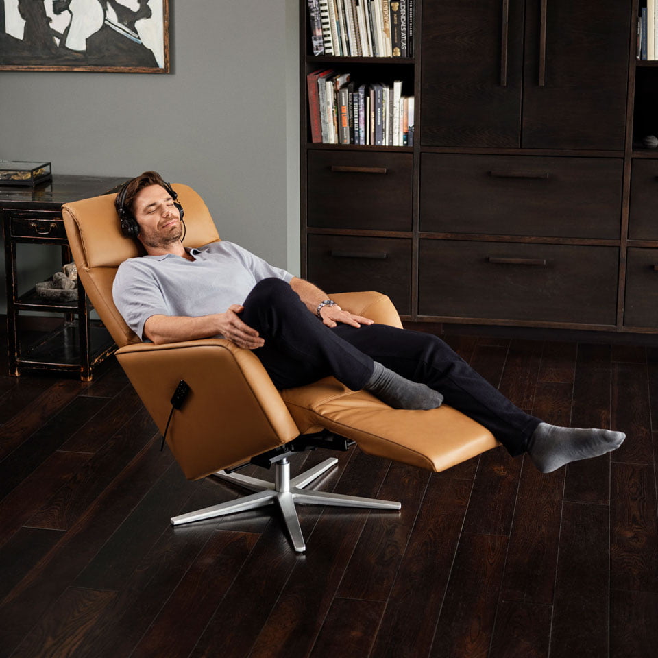 Hvilestolene Stressless® Sam og Stressless® Scott har motoriserte funksjoner og fullt integrert benstøtte. Sete og rygg er ergonomisk formet, og fleksibel fjæring kombinert med høyelastisk skum og mykt fiber gir en fantastisk dybdekomfort. Plus™-systemet sikrer perfekt støtte for hode og korsrygg i alle sittestillinger.